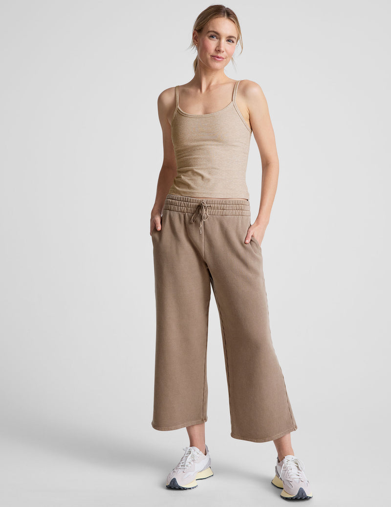 Beige Cali Wide Leg Cropped Pant featuring a gathered elastic waistband, side seam pocket, and soft terry fabric.