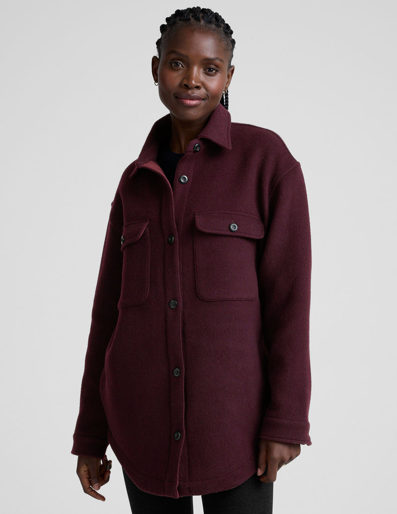 woman wearing a burgundy shirt jacket on a plain background.