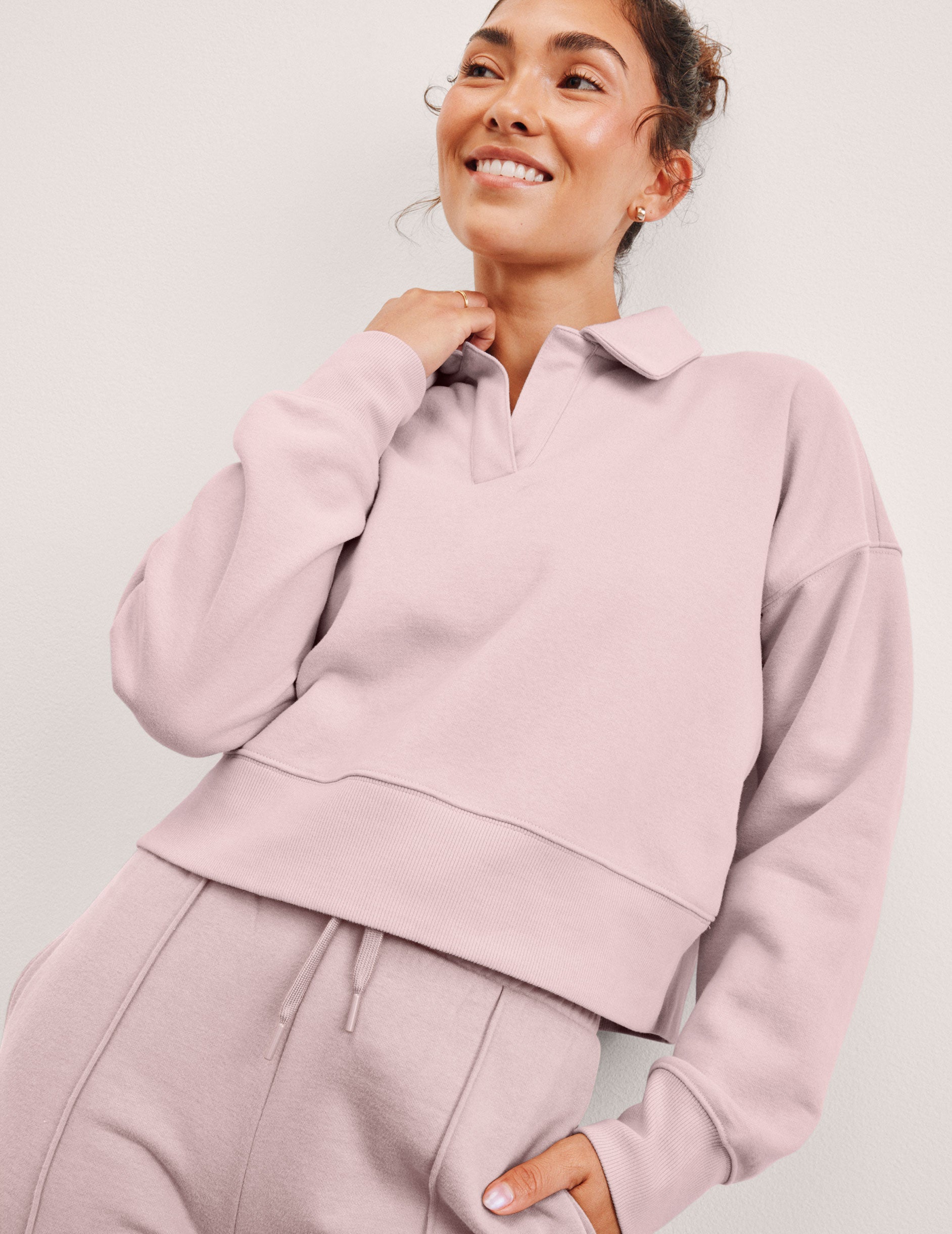 Serious about softness. Our new LuxeFleece Collared Sweatshirt has all of the comfort and warmth you love with cropped length and collared neckline for you to put your own spin on when you style the shirt.