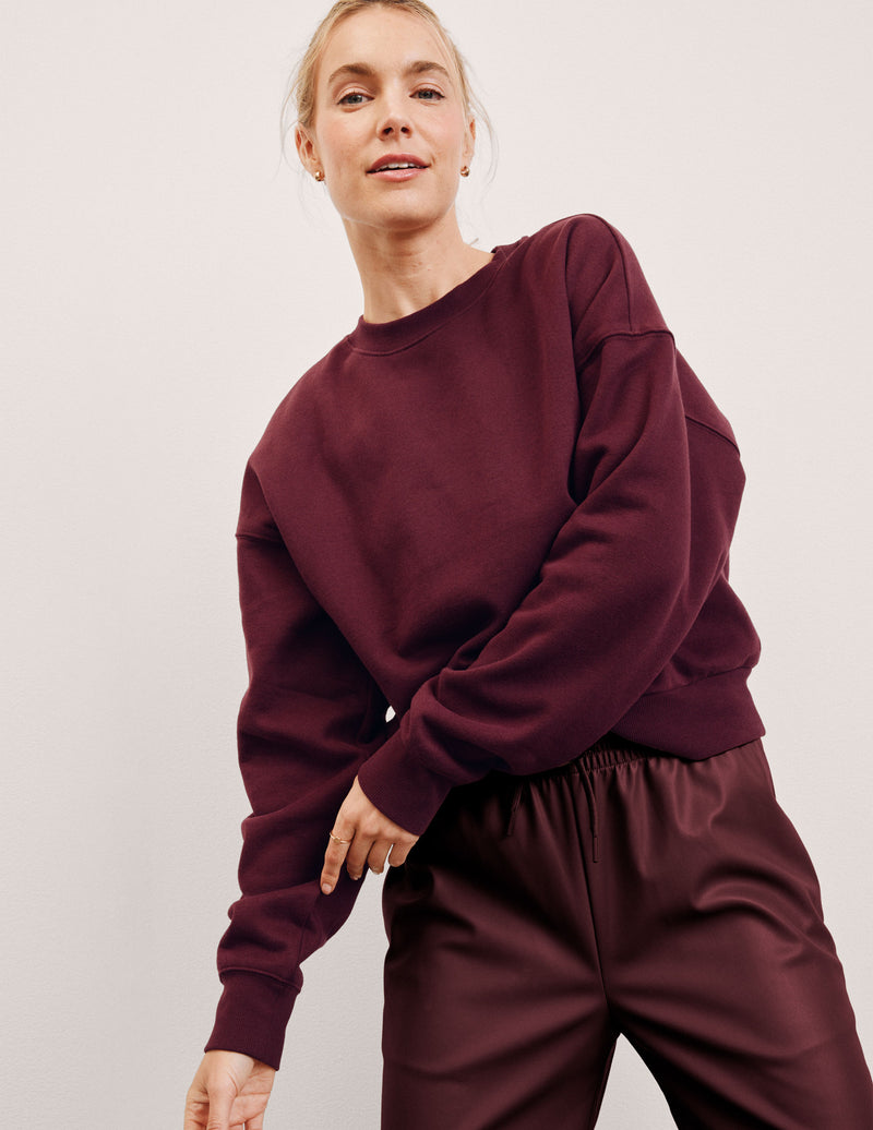 Person wearing a burgundy sweatshirt and pants on a light background.