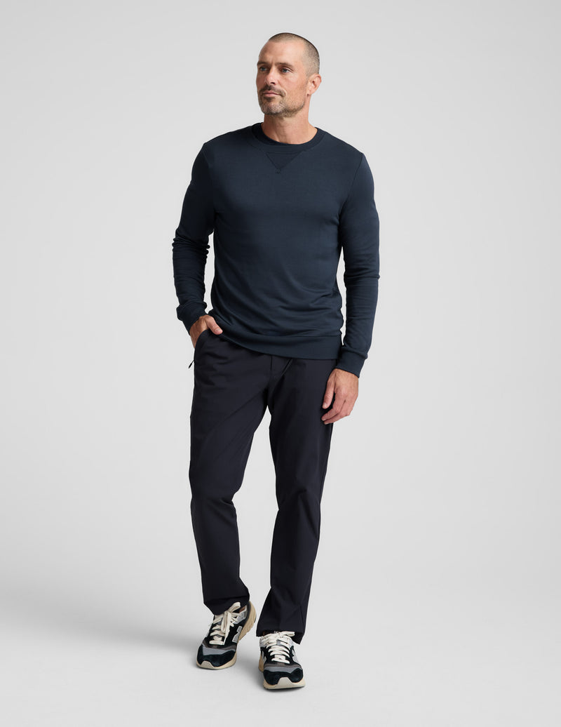 Man wearing navy Men's All Terrain Pant in a relaxed straight fit with zipper pockets, sweatshirt, and sneakers.