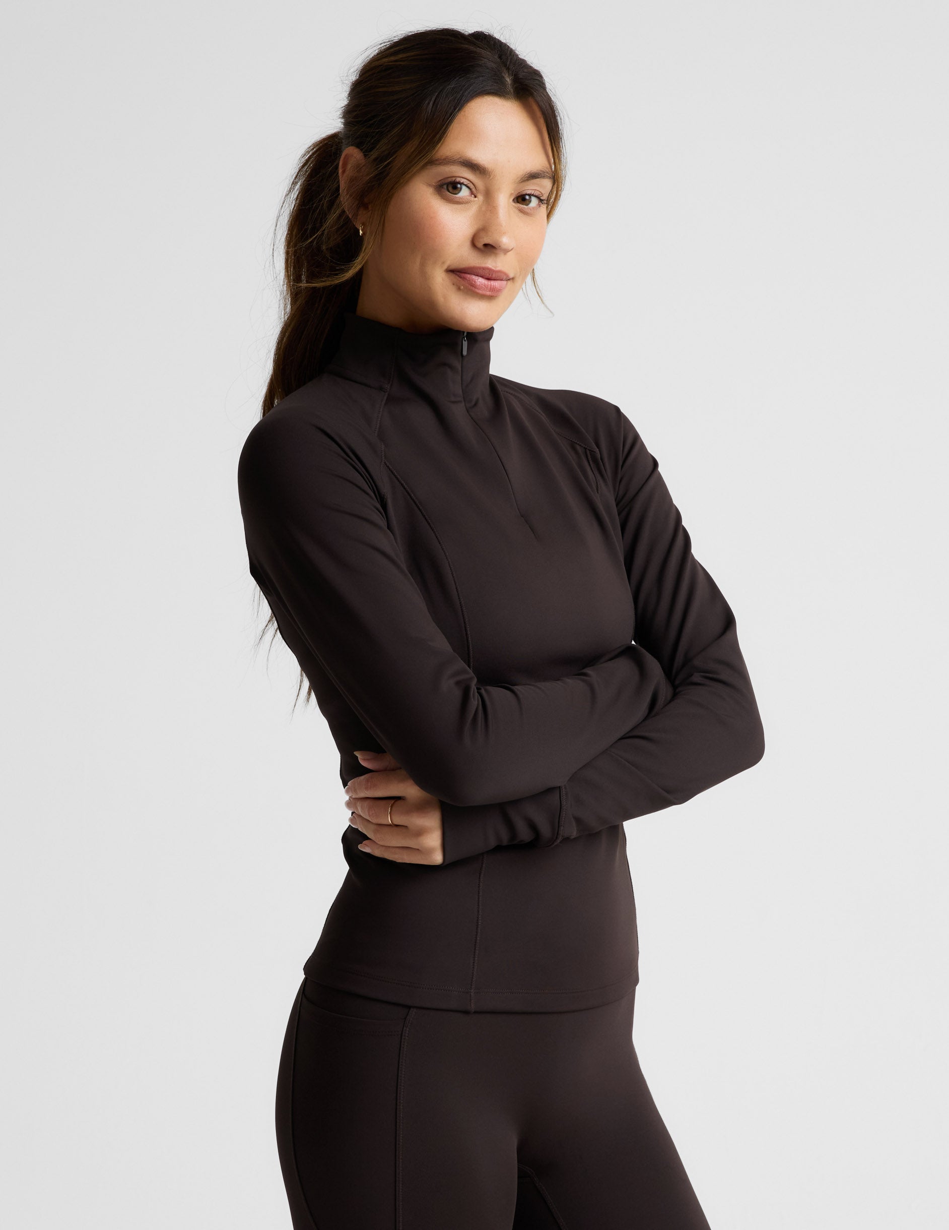 Woman wearing a brown quarter zip pullover and leggings on a light gray background.