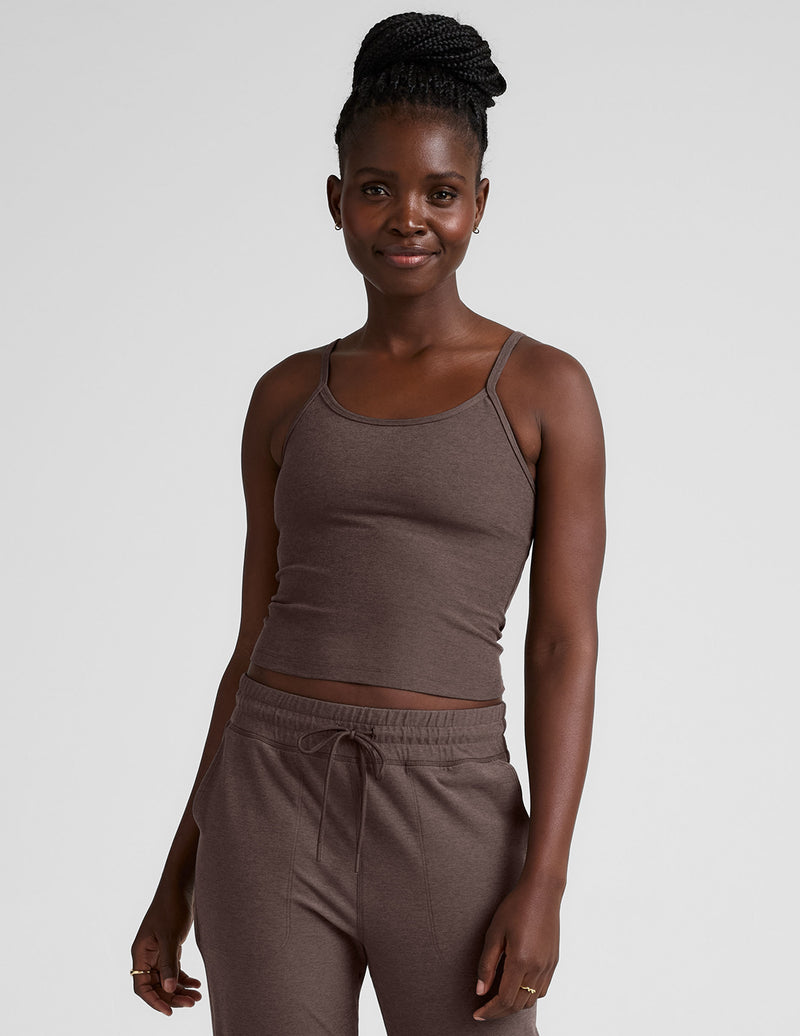Woman wearing a brown mid length tank top and joggers against a plain background.