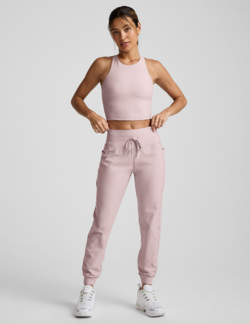 Woman wearing a pink cropped tank and joggers with pockets and a drawcord on a light gray background.