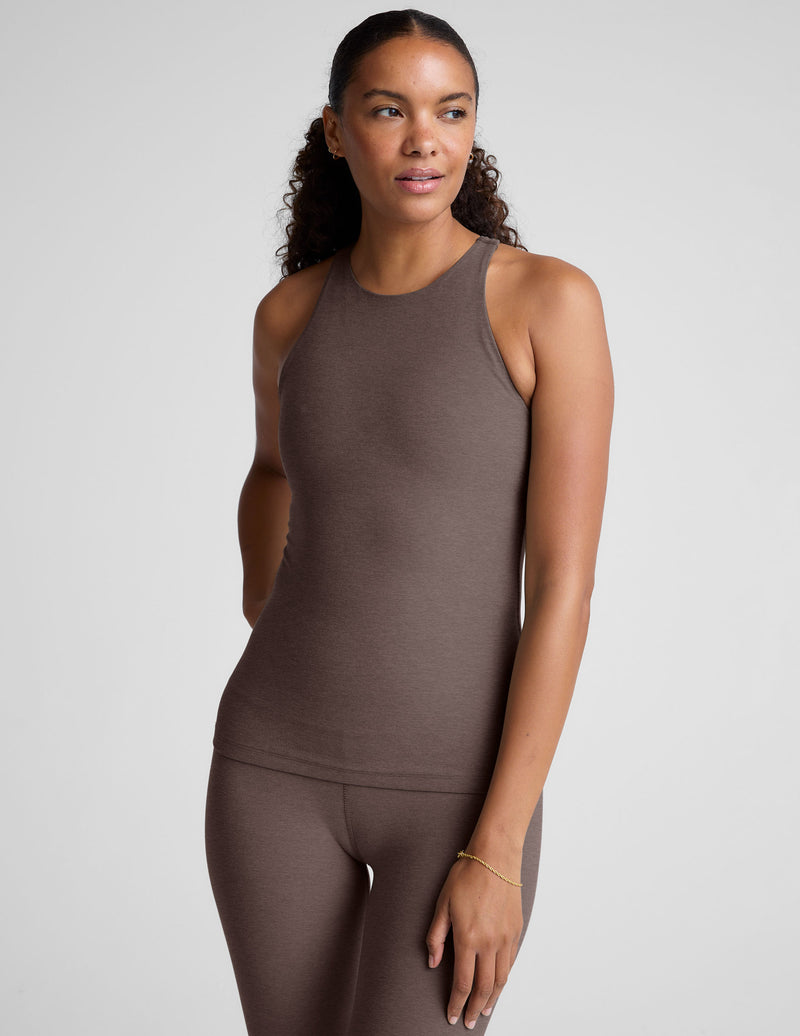 Woman wearing a brown high neck racerback tank top and leggings on a light gray background.